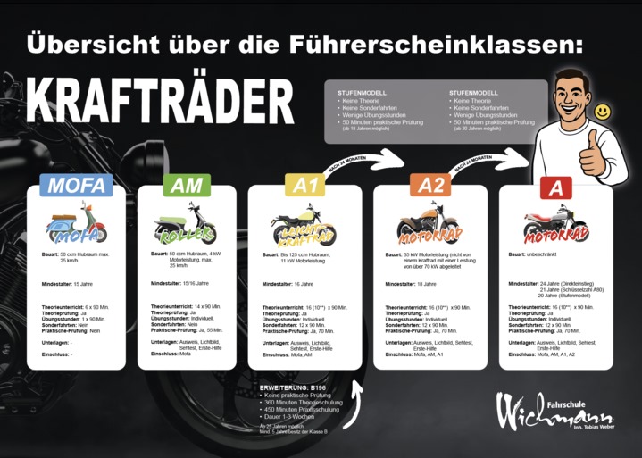 Egal ob Zweirad oder Auto – bei uns bist du in den besten Händen. Wir bieten Ausbildungen in folgenden Führerscheinklassen an: